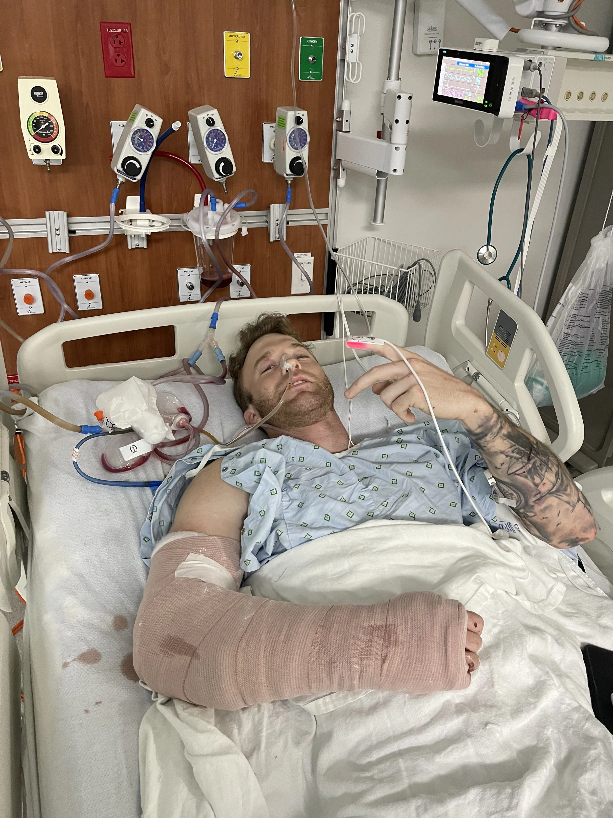 After a serious car crash, Tad suffered severe lacerations to his internal organs, complete breaks in his right arm, and total destruction of his right knee.